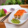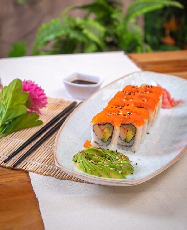 Relleno de palmito de cangrejo, aguacate y pepino cubierto de masago y ajonjoli.